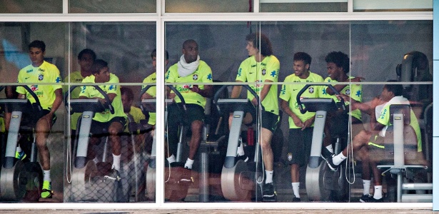 Jogadores da seleção fazem ginástica na Granja Comary nesta terça-feira