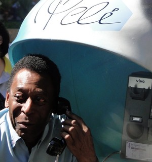 Um dia depois de conceder longa entrevista coletiva no lançamento de um livro, onde comentou a convocação para a Copa, Pelé fez apenas uma rápida aparição nesta manhã, assinando o "orelhão" e fingindo que conversava com o técnico Luiz Felipe Scolari, com o coordenador técnico Carlos Alberto Parreira e com Neymar, principal astro da Seleção.