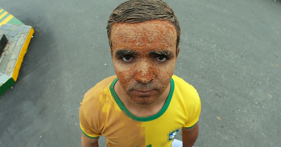 Flávio foi à porta da Granja Comary, onde a seleção se prepara para a Copa do Mundo, vestido com um uniforme do Brasil e pintado de lama em metade do corpo. A ideia dele era retratar os dois lados de Teresópolis, uma das áreas mais atingidas pelos deslizamentos e enchentes que castigaram a região.