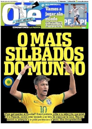 A edição de hoje do jornal Olé, da Argentina, estourou na capa uma foto de Neymar pedindo apoio à torcida e manchetou que a seleção brasileira é a "mais vaiada do mundo". "Para que queriam o Mundial? O Brasil protesta, vaia a sua seleção que goleou o Panamá por 4 a 0, parece estar chateado e não feliz por organizar a Copa. Neymar mostrou sua liderança e pediu paciência às pessoas: 'São mal-agradecidos!'", diz a capa do jornal.